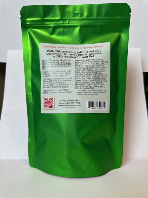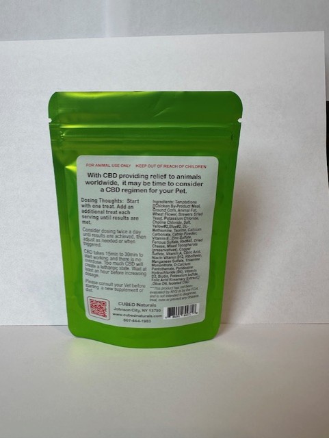 CUBED Naturals CBD Pet Treats help to make dosing your favorite pet a little easier. We have taken the time to enhance recocnized pet treats with a defined dose of our CBD tincture. Now instead of fighting to direct oral spraying or waiting for the tincure to desolve into the hard treat, you just need to reward with an appropriate amout of treats. With two sizes for our dog lovers and one for our feline freinds, dosing can now be quick and hassle free.